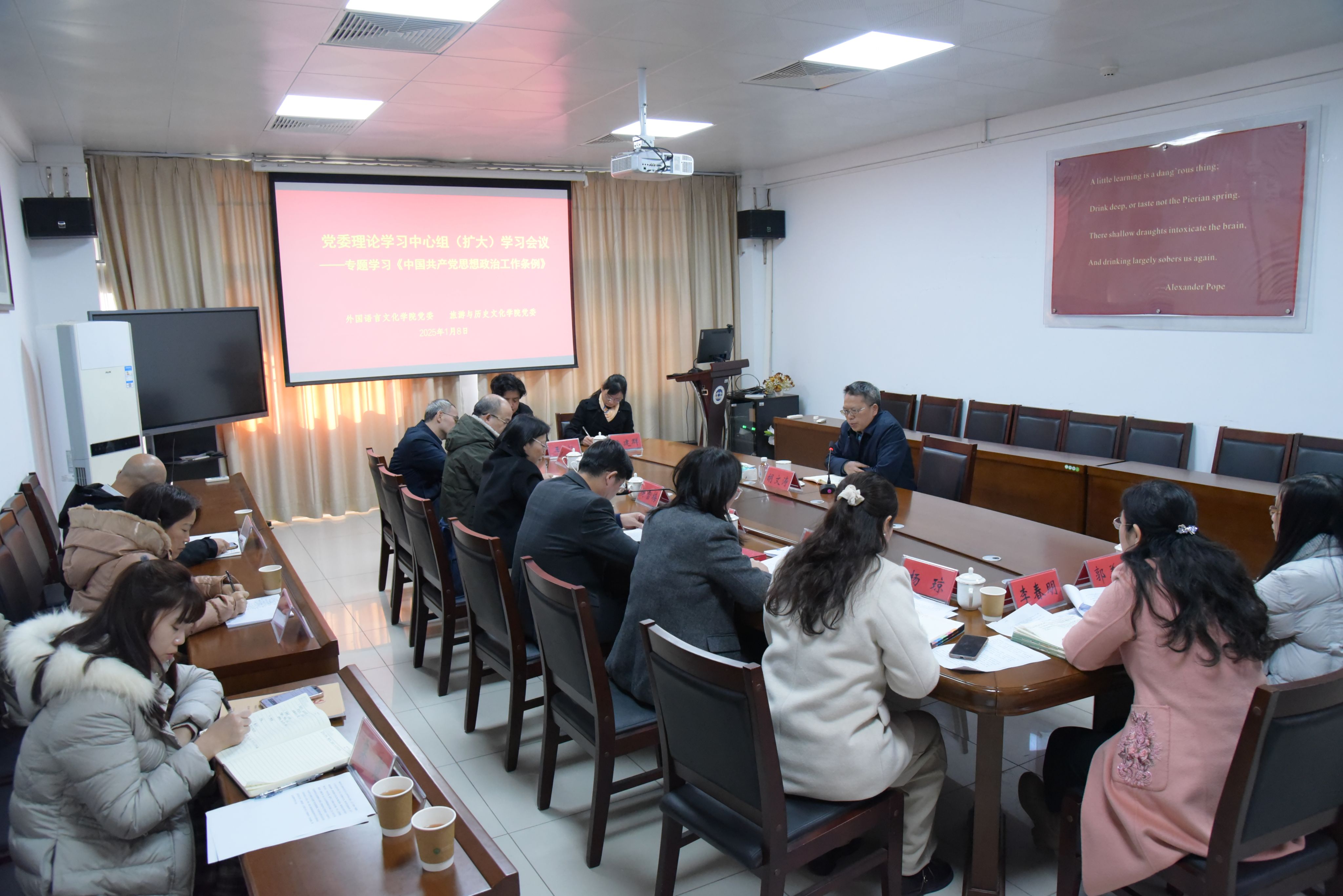 本网讯 2026年1月8日,外国语言文化学院与旅游与历史文化学院联合举行党委理论学习中心组(扩大)学习会,专题学习《中国共产党思想政治工作条例》(以下简称《条例》)。副校长胡文涛列席会议并点评。两学院党政领导班子参加会议,会议由外语学院党委书记卢咏主持。会议第一议题由卢咏领学习近平总书记发表的2026年新年贺词。在中心组学习环节,卢咏表示,《条例》是党的思想政治工作史上首部基础性主干性党内法规,标志着思想政治工作进入科学化、...
