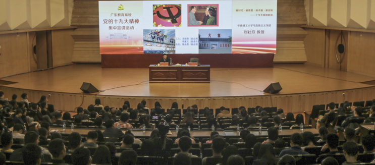 本网讯 为了帮助和促进广大师生进一步学习领会党的十九大精神,12月8日,由广东省委教育工委主办的广东教育系统党的十九大精神集中宣讲活动在我校举行。全省教育系统党的十九大精神集中宣讲团成员、华南理工大学马克思主义学院刘社欣教授担任主讲人,校党委副书记叶峥嵘主持,来自全校各级党组织的党员干部、师生代表400余人出席。 宣讲会上,刘社欣紧扣党的十九大报告,从新时代、新思想、新矛盾、新征程等四个方面...