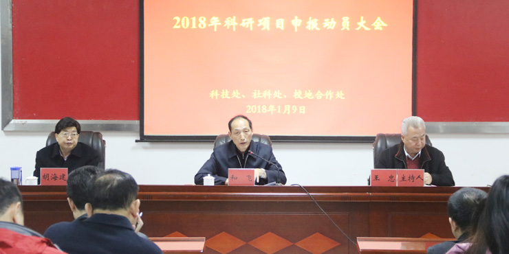 本网讯 1月9日,我校举行科研项目申报动员大会,总结过去一年科研工作,部署新一年的科研任务,为新一轮“申硕工程”做好准备。校长和飞出席并作讲话,副校长王忠主持。社科处、科技处、校地合作处及各二级学院和部门相关负责人、科研人员参加。 和飞在讲话中表示,2017年是我校科研工作丰收的一年,我校在科研立项、科研经费、科技成果转化等方面都取得不错成绩,在高校向应用型转型的背景下,我校科研工作要坚定高...