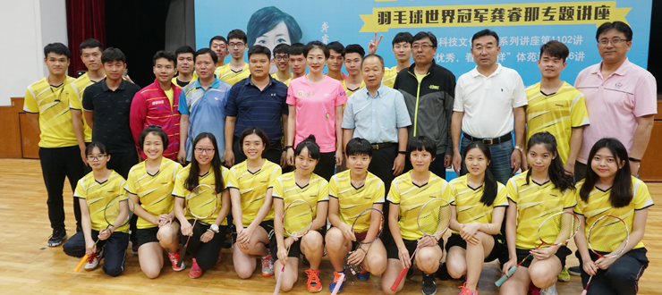 本网讯 4月28日,羽毛球世界冠军龚睿那应邀到我校,为广大羽毛球爱好者做题为《高校羽毛球运动普及推广及羽毛球带来的益处》的讲座。校党委副书记黄劲松出席,体育学院党委书记李永佳主持。 讲座开始前,我校的羽毛球院队进行了精彩的男单和女双比赛,现场掌声不断,龚睿那为这场简短的比赛做出点评,对我校球员的表现给予肯定。 讲座上,龚睿那分享了她的冠军心路。她表示,兴趣是最好的老师,鼓励同学们找好...