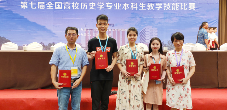 本网讯 7月20日至24日,在第七届全国高校历史学专业本科生教学技能大赛中,旅游与历史文化学院代表队勇创历年最佳成绩,2016级历史学黄晓春同学获得一等奖,李俊锦和莫漫媛同学荣获二等奖。 本次比赛由中国高等教育学院教师教育分会主办,在江苏举行,是历史学专业教学技能方面的国家级赛事。比赛吸引了全国102所高校的近400名选手同场竞技。大赛由教学设计文稿、说课、模拟授课、现场答辩四个单项构成,对参赛选手的...