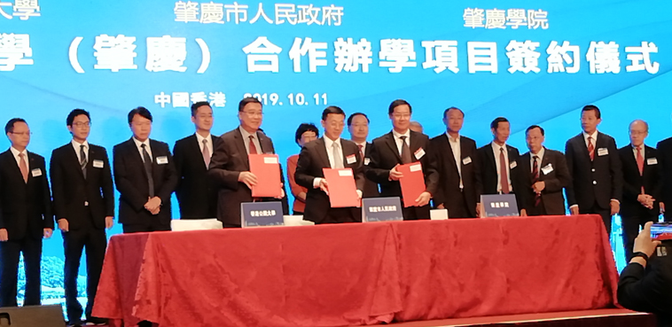 本网讯 10月11日,校党委副书记、主持行政全面工作副校长吴业春出席我市在香港举办的2019肇港携手共建粤港澳大湾区交流会及系列经贸交流活动,并作为我校法人代表,与肇庆市人民政府、香港公开大学共同签署 香港公开大学(肇庆)合作办学项目备忘录。 备忘录明确,将依托肇庆市人民政府、香港公开大学及肇庆学院三方的优势和资源,按照中外合作办学的方式共同创办一所具有独立法人资格的本科及以上层次大学,以贯彻国...