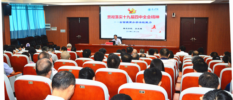 本网讯 11月12日,根据“不忘初心、牢记使命”主题教育总体部署安排,校党委副书记、主持行政全面工作副校长吴业春以《贯彻落实十九届四中全会精神——全面提高办学治校能力》为题讲授主题教育专题党课。学校领导,党委委员,全体中层领导干部和学校主题教育办各工作组(含督导组)组长参加学习。 吴业春首先传达了十九届四中全会精神,并对全会公报“六大亮点”和“十四个关键词”进行了解读。全会公报提出中国特色...