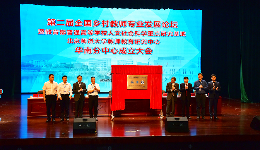 本网讯 11月21日,我校主办第二届全国乡村教师专业发展论坛,在论坛开幕式上,同时举行了教育部普通高校人文社会科学重点研究基地北京师范大学教师教育研究中心华南分中心在我校揭牌仪式。这是首个在华南地区设立的分中心。 广东省教育厅主任督学李璧亮,广东省教育研究院党委书记、院长傅湘龙,北京师范大学教育学部部长朱旭东教授,北京师范大学教师教育研究中心副主任、教师教育研究所所长宋萑教授,校党委书记曾桓松...