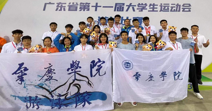 本网讯 5月24-29日,广东省第十一届大学生运动会游泳比赛在广州市奥林匹克游泳馆开赛。教练员邢执、向军率领我校代表队参加比赛,通过努力拼搏,获得1金、1银、1铜、1个第四名、6个第五名、2个第六名、6个第七名、3个第八名的历史最好成绩。其中的金牌,是我校参加本届省大学生运动会以来的首枚金牌。左二为男子乙A组200米蛙泳金牌获得者(2019级体育教育专业陈泽彬