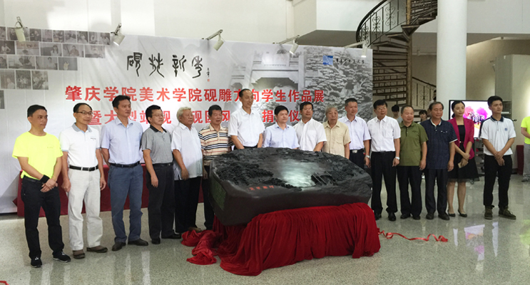 本网讯 9月19日,美术学院砚雕方向学生作品展暨大型端砚“砚园风采”捐赠仪式在美术馆举行。本次展览获得中国文房四宝协会、广东省端砚协会指导。校党委书记曾桓松,校长和飞,校党委副书记叶峥嵘、黄劲松,广东砚文化研究基地主任骆礼刚,肇庆市文联主席朱英中,工艺美术大师黎铿,端砚协会会长王建华等领导嘉宾出席了开幕式。 此次展览主要展出2014级端砚大专班和本科班的砚雕作品,其中包括大专班学生集体创作并捐...