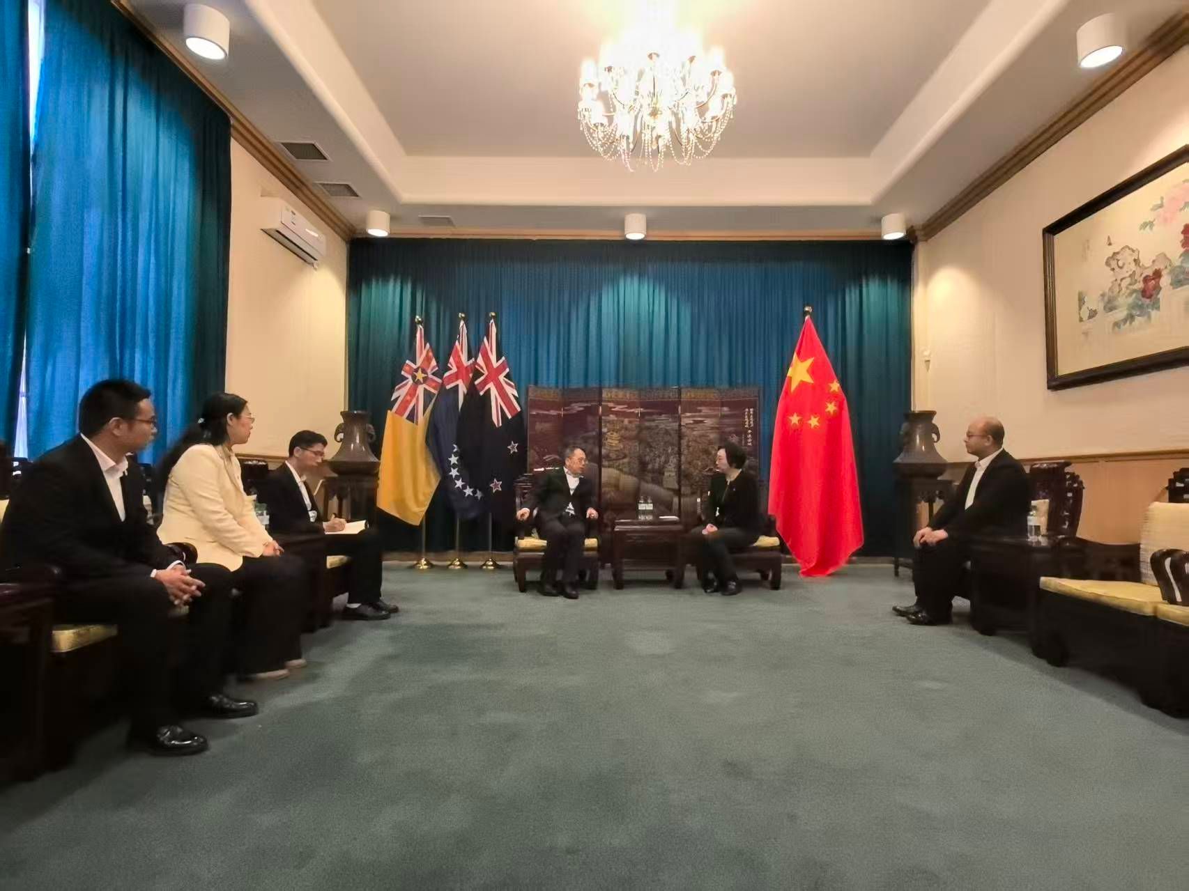 代表团一行还拜访了中国驻新西兰大使馆,大使馆教育、科学与技术和文化事务参赞唐筠会见代表团。胡文涛重点汇报了我校办学成绩,以及与新西兰高校的合作成效与未来规划,并对使馆长期以来给予学校的支持表示衷心感谢。唐筠肯定了学校取得的发展成就,并表示将继续为学校在新西兰开展国际交流合作提供支持。