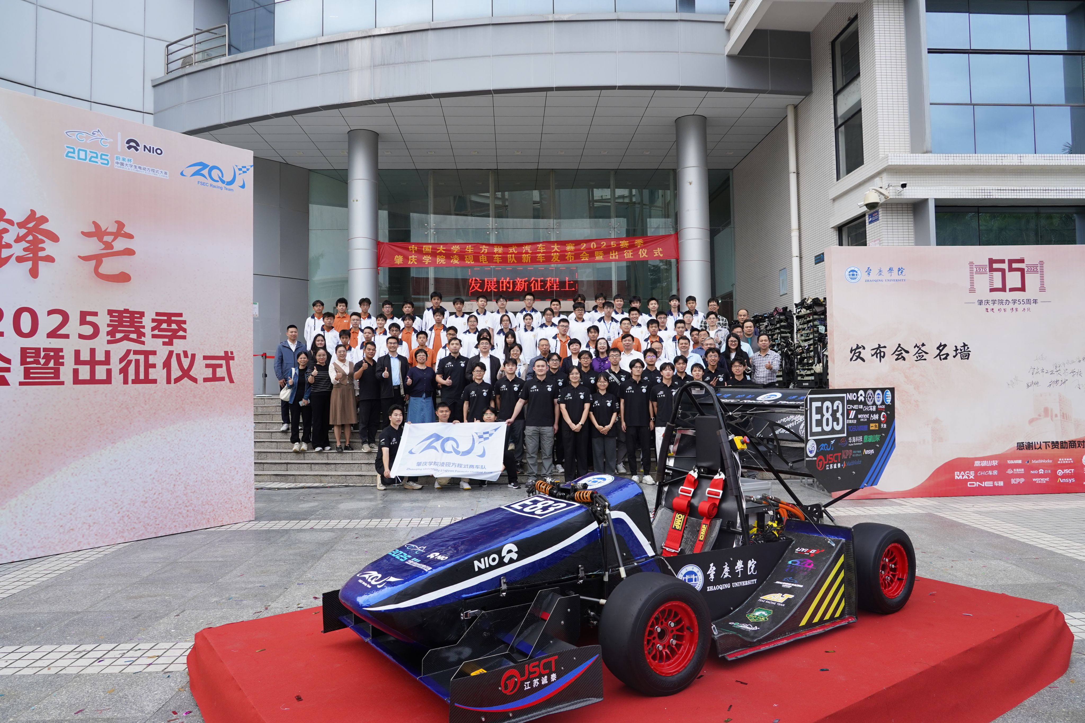 本网讯 11月12日下午,在学校办学55周年高质量发展大会来临之际,中国大学生方程式汽车大赛2025赛季肇庆学院凌砚电车队新车发布会暨出征仪式在学校图书馆门前广场举行。本次新车发布会主题为“凌云逐风,砚展锋”。新车代号“凌砚-25”,车号E83,将以“凌云逐风,砚展锋芒”之姿,整装出征合肥赛场。副校长胡文涛出席活动、机械与汽车学院党委书记田华、相关职能部门负责人、合作企业代表、校友及师生家长共同参与,并为新赛车揭幕。