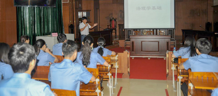 图片说明:6月29日,由政法学院承办的肇庆市人民检察院合同制司法辅助人员岗位适配能力提升培训班在学院模拟法庭开班。政法学院作为检察官培训基地的功能在该培训项目中得以充分体现。图为教务处副处长梁晓颖博士以本项目负责人的身份为培训学员讲授《法理学基础》一课。