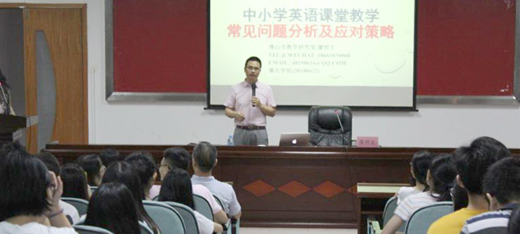 本网讯 日前,佛山市教育局教研室高中英语教研员、中学英语高级教师廖明生应外国语学院邀请,为该院学子开展“中小学英语课堂教学--常见问题分析及应对策略”专题讲座,江晓红院长主持讲座,并为廖明生颁发聘书,聘请其为外语学院客座教授。