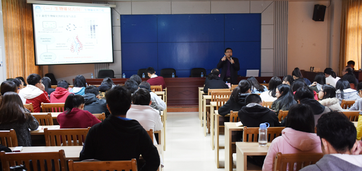 在论坛上,李映伟教授介绍了MOFs材料的特点、应用领域以及研究方向。娄文勇教授介绍了在食品生物化工发酵工程、生物催化的方向、新型生物催化剂的发现与改造、绿色反应介质“离子液体”中生物催化以及生物质的高效转化及利用等内容。针对师生的提问,两位学者结合自身研究经历作了详细解答。此外,两位学者还就国家自然科学基金项目的申报、科研、专业和学科建设等方面与教师进行广泛和深入的研讨。