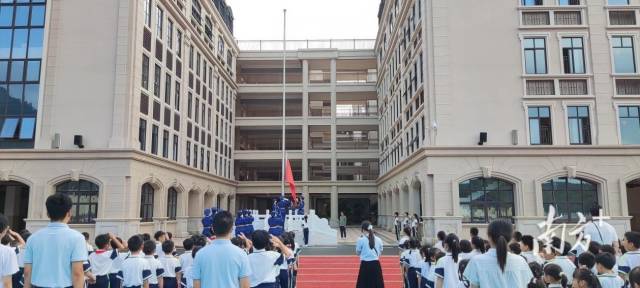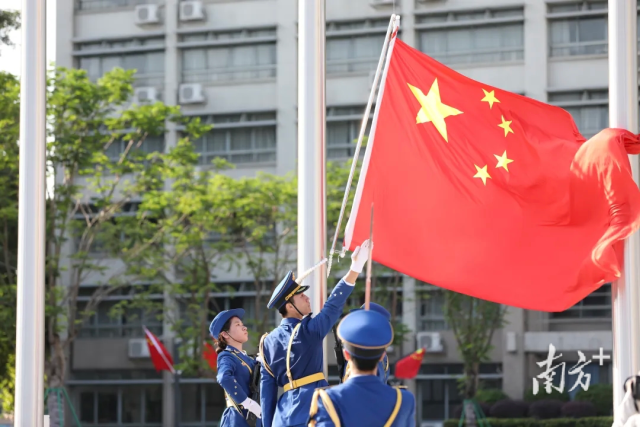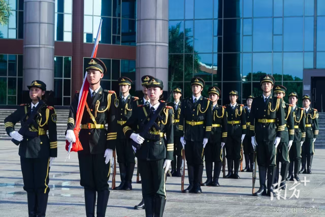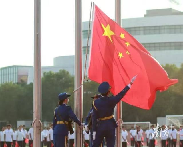 在广东高校里,一群年轻的身影迎着朝阳而立。他们步履铿锵、目光坚定,以昂扬之姿将五星红旗护送至旗杆之下,在晨曦中升起一抹庄严的红色。