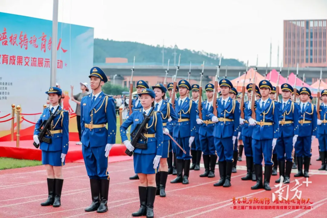 今年五月,国旗护卫队参加第三届广东省学校国防教育成果交流展示活动,表现卓越,充分展现了精湛的军事技能和良好的精神风貌。
