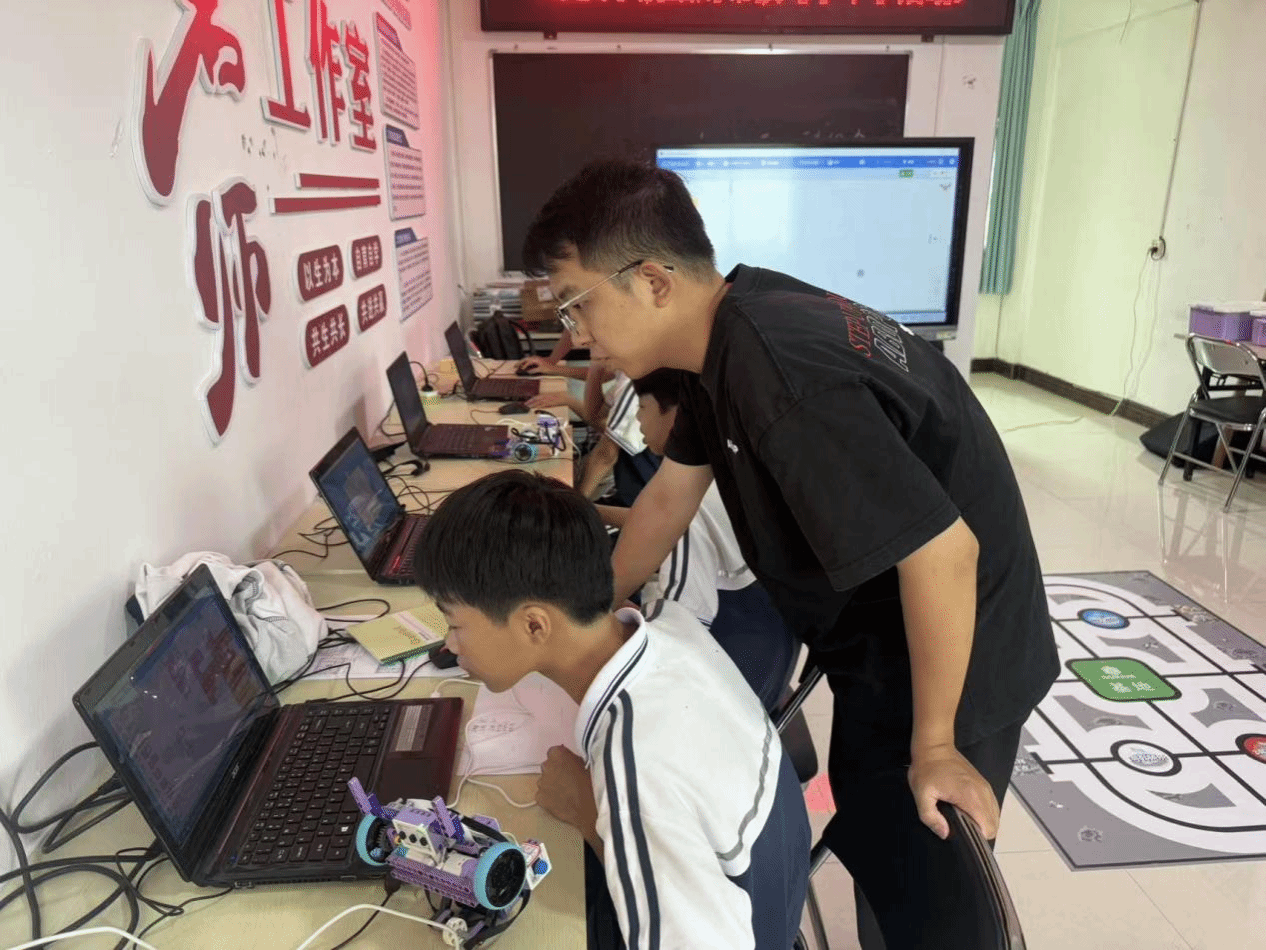在前期诊断式调研中,帮扶队发现马宁中学在科创教育方面存在基础较为薄弱、备赛经验不足的情况。为此,教育科学学院“三所学校”帮扶小组精准把脉,协调资源,组建社会机构及校内教师组成专家团队,系统开展帮扶。帮扶链条环环相扣、持续发力,从项目申报持续线上答疑,到多次邀请机器人编程专家入校指导。专家以示例程序为模板,深入浅出地拆解了机器人编程的核心步骤与常见误区,并通过“手把手”的实操演练与互动答疑,迅速扫清了学生备战过程中的技术障碍。此外,专家还围绕比赛流程、内容与关键注意事项进行全面解析,显著提升了师生的实战能力和参赛信心。