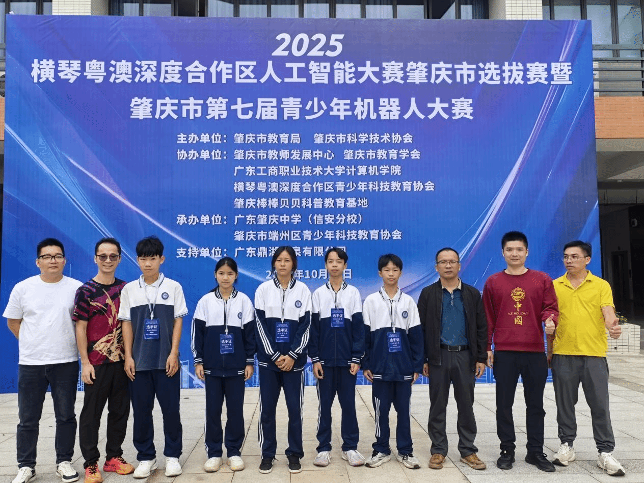本网讯   为深入贯彻落实“三所学校”和县中质量提升工作部署,教育科学学院在对口帮扶怀集县工作中精准施策,积极打造科创教育特色。近日,帮扶工作结出硕果——在“2025横琴澳深度合作区人工智能大赛市选拔赛暨肇庆市第七届青少年机器人大赛”中,怀集县马宁初级中学五名参赛学生表现优异,斩获两个一等奖、三个三等奖,成为教育科学学院帮扶成效的生动体现。