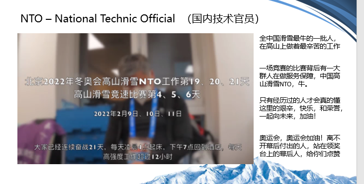 比赛最后一天,为了高山滑雪项目顺利完赛,NTO们一直在等大风停止。而疲劳极致时,国内NTO们的精神力量来源是祖国!他们在寒风凛冽中唱响“我和我的祖国,一刻也不能分割......”余音袅袅,深入人心。