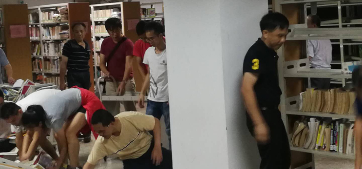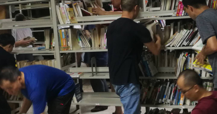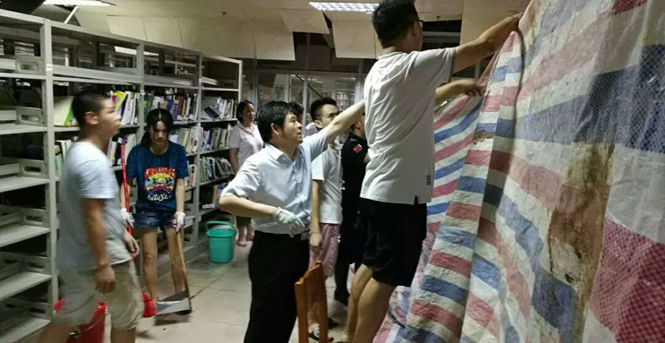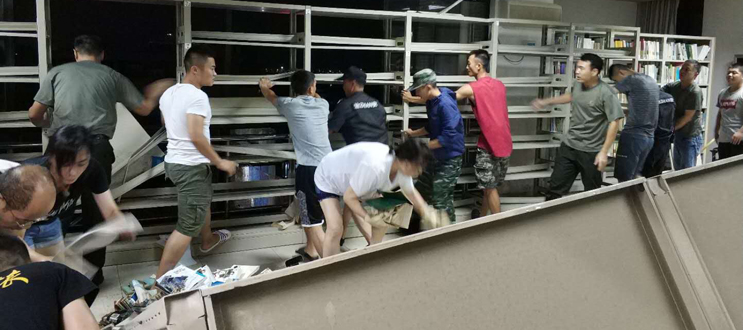 一条请求帮助的信息在学校的工作群里发了出来。这条信息在简单说明图书馆遭遇的情况后说:“请各单位号召校内居住的教职工前往图书馆帮忙。”这条文字极其简洁、口吻极其诚恳的信息发出去不一会儿,驰援图书馆的人员就迅速抵达现场,与原来就在那里忙碌的人员一起投入到转移图书的工作中。这些驰援的人员,既有多个职能部门的干部职工,也有多个教学单位的专职教师。而其中,有日常奔波于校园治安第一线的校卫队,有即将投入到新生军训指导工作的高年级学生教官,更有刚刚进校工作不久、来自宝岛台湾的5名博士。此时此刻,大家有一个共同的信念,就是与时间赛跑,以最快的速度,把象征学校重要文化资产的图书转移到安全的场所。