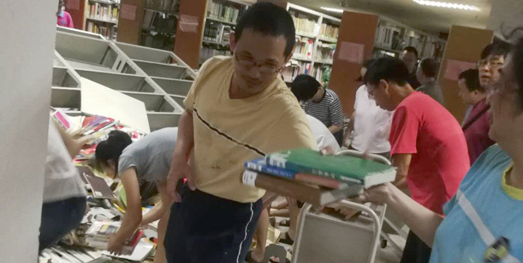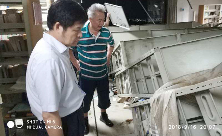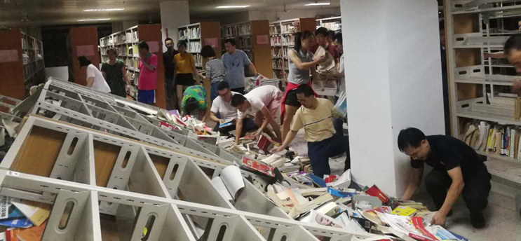 当天下午,在台风的猛烈吹击下,图书馆5楼、6楼书库的玻璃窗破碎,横冲直撞的风雨乘机灌入书库,掀翻书架,打散书籍。众所周知,纸质图书一旦沾水,就很容易变质、发霉、腐烂、作废,这些图书当时就面临着这种危险的威胁。情况严峻而又紧急。