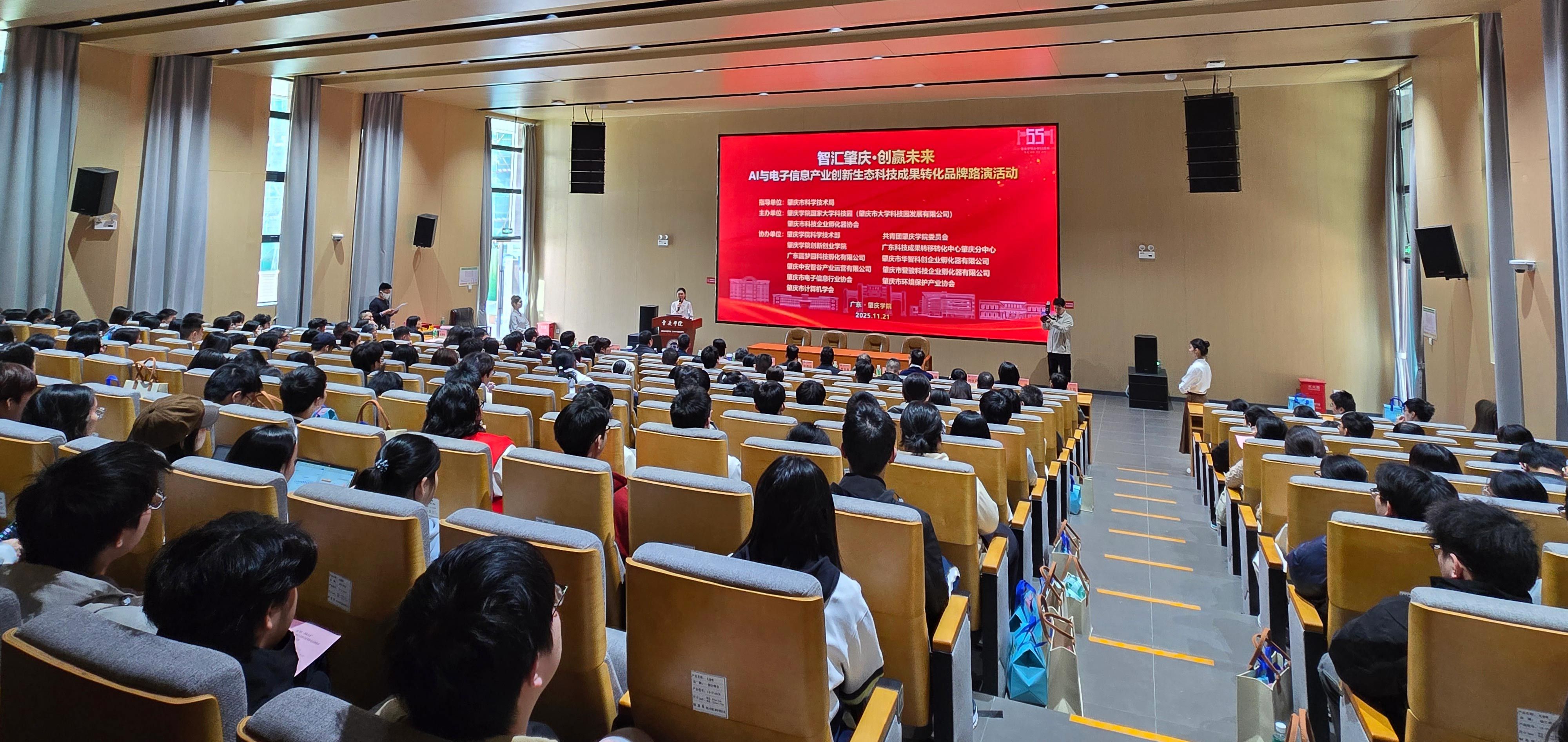 本网讯 11月20日,在肇庆市科学技术局指导下,由我校国家大学科技园、肇庆市科技企业孵化器协会联合主办,我校科学技术部、团委、创新创业学院等协办的“智汇肇庆·创赢未来——AI与电子信息产业创新生态科技成果转化品牌路演活动”在我校新校园报告厅举办。副校长李新昌出席,肇庆市科技局副局长叶护华,国家大学科技园管委办主任肖俊霞等相关单位负责人,以及来自政府、高校、企业、协会、金融机构代表250余人参加本次活动。