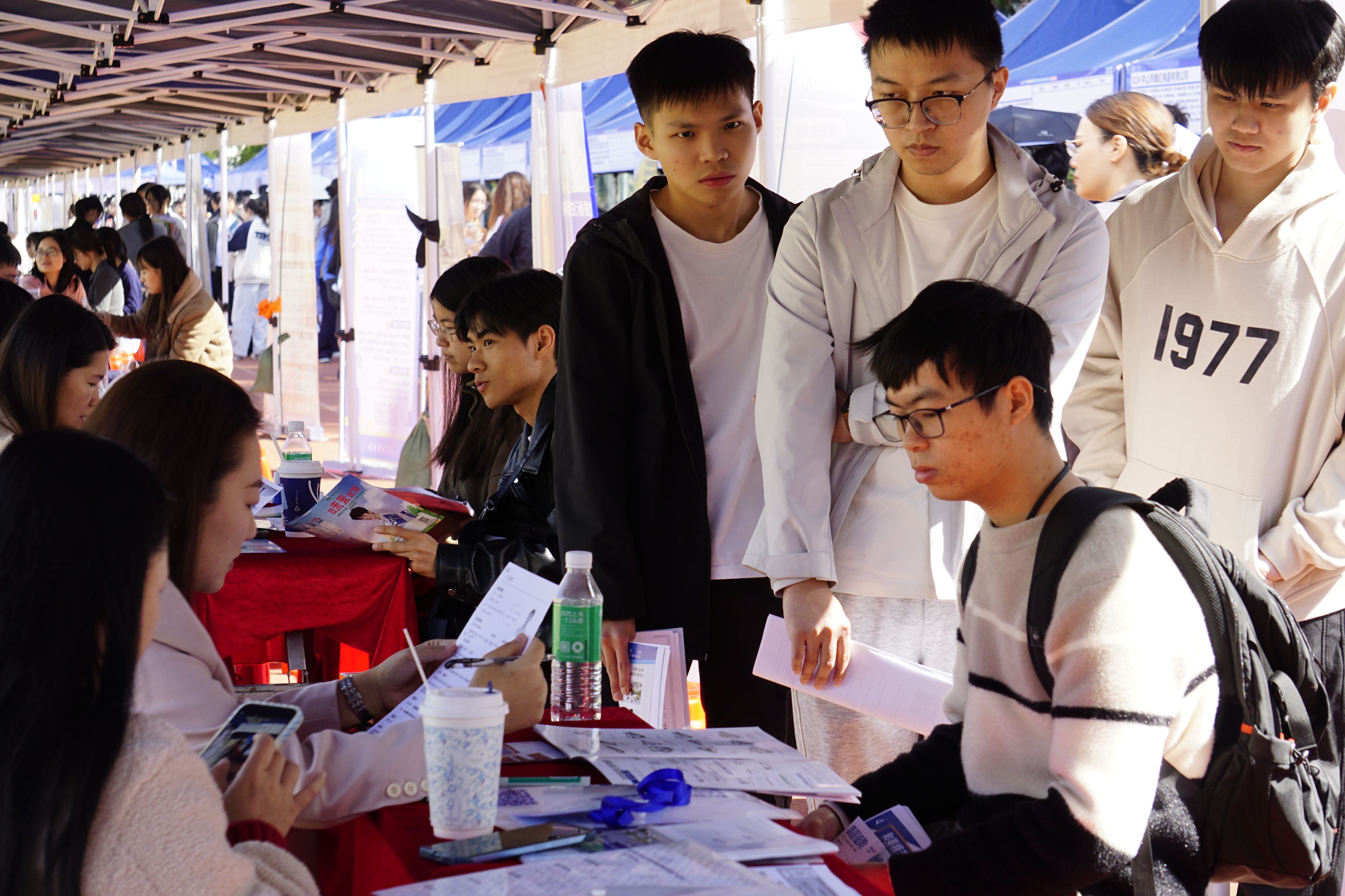 活动现场,用人单位招聘人员在摊位前展示企业基本情况、招聘需求、岗位要求等信息,以方便毕业生快速寻找到与自身需求相匹配的岗位。应届毕业生结合自身发展路径,在各摊位咨询岗位要求,积极与用人单位招聘人员沟通交流,主动咨询了解用人单位基本情况、岗位职责、薪资待遇等相关信息,求职热情高涨。招聘工作人员根据企业情况答疑解惑,为毕业生提供多元咨询服务,招贤纳才。供需双方友好交流,达成良好对接。