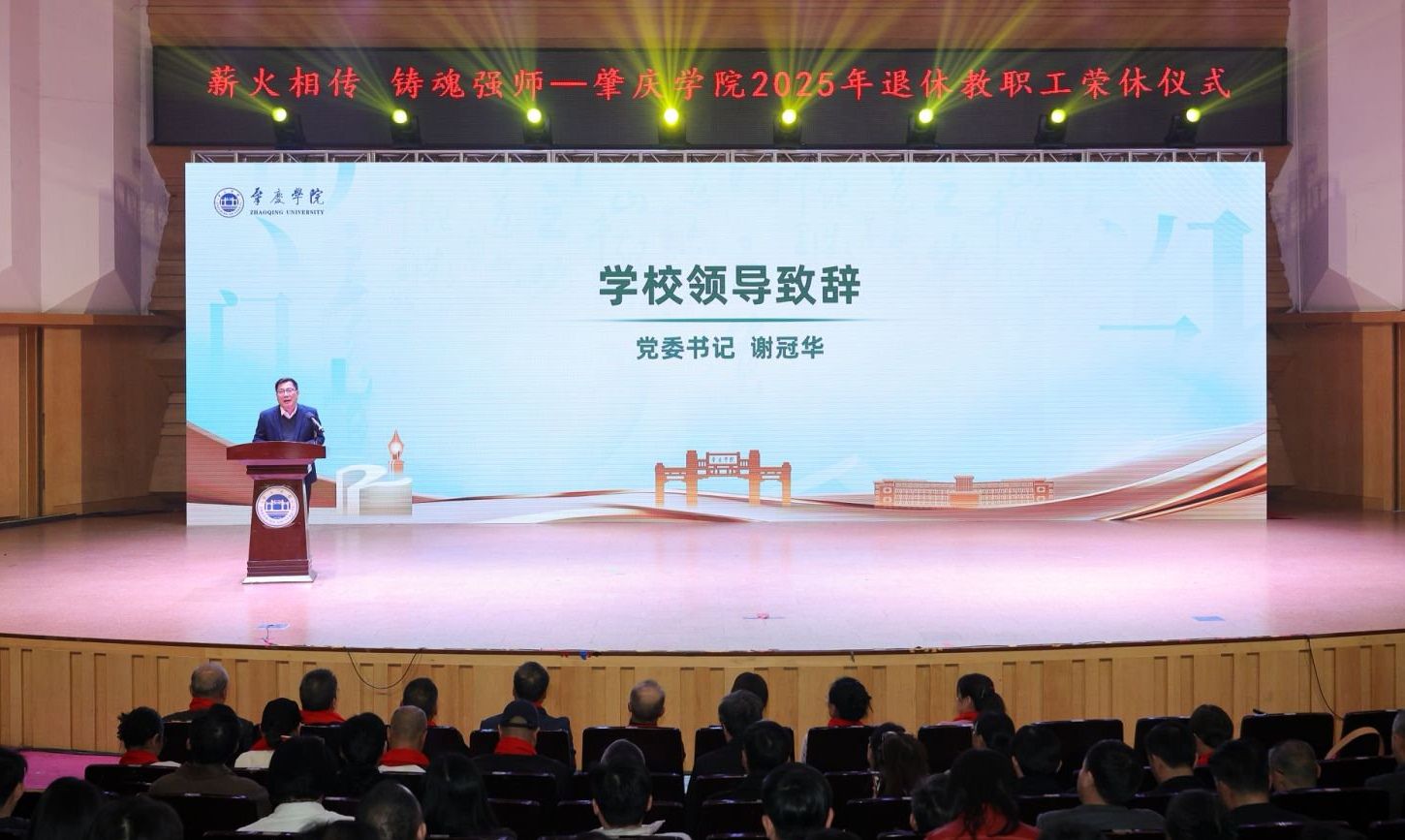 仪式在回顾学校发展历程与退休教师执教风采的视频中拉开帷幕。谢冠华代表学校致辞。他回顾了荣休教职工作为学校事业发展的奠基者、推动者与贡献者,在学科建设、办学层次提升、校园发展等关键历程中倾注的心血与智慧。从学校获批硕士学位授予单位、成功转制省属公办高校,到新校园建设、被确定为博士学位授予立项建设单位,乃至当前全力冲刺“改大申博”的新征程,每一步都凝聚着荣休教职工的辛勤耕耘。谢冠华书记强调,荣休教职工是学校的宝贵财富,其敬业精神、深厚学识与高尚师德已融入砚园文化血脉。他提出三点期待:希望荣休教职工永葆教育情怀,做育人薪火的“传递者”;持续贡献智慧,做学校发展的“护航人”;广泛传播美誉,做砚园精神的“代言人”。