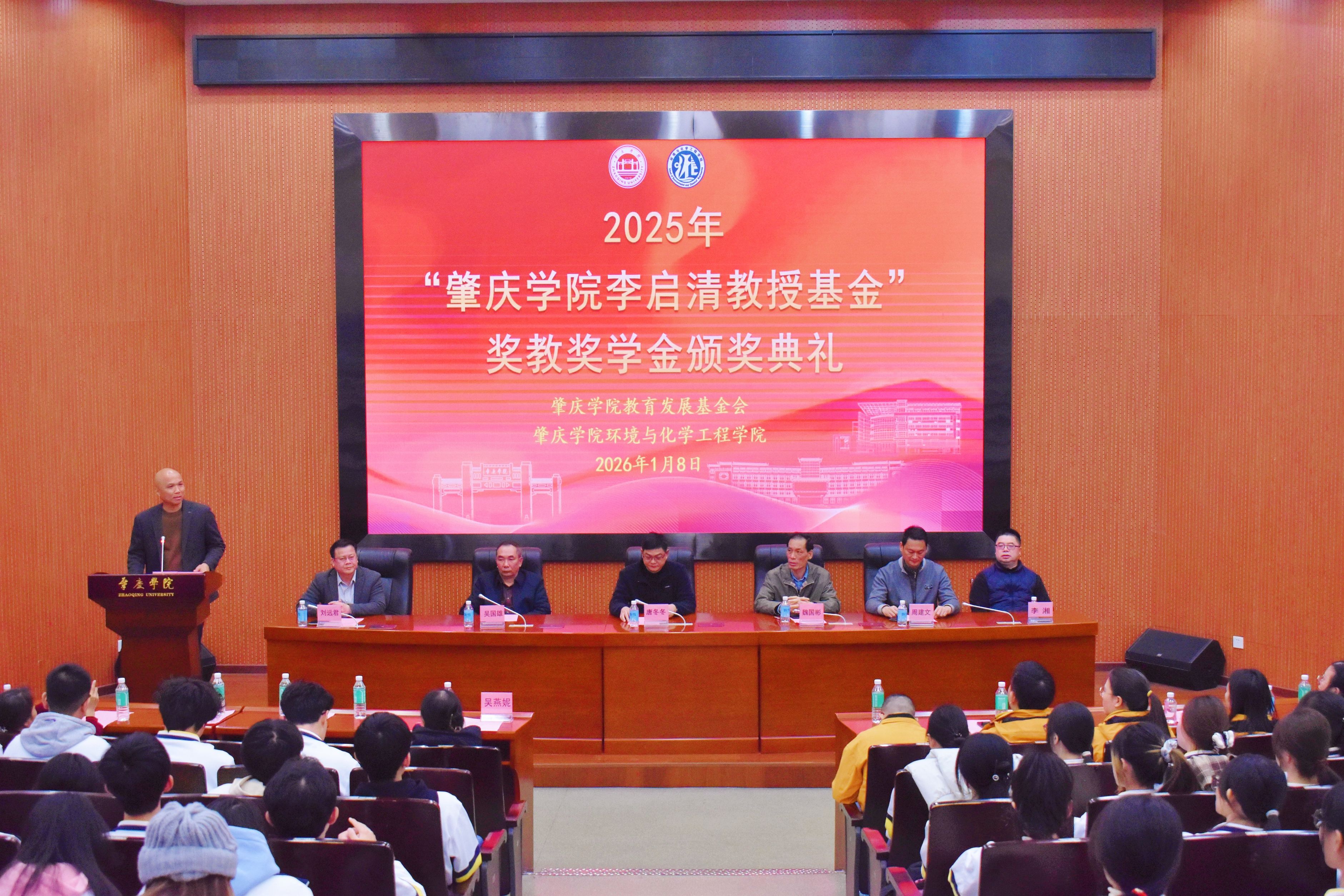 本网讯 1月8日,肇庆学院“李启清教授基金”奖教奖学金颁奖典礼在福慧图书馆学术报告厅举行。副校长唐冬冬出席典礼。优秀校友代表、肇庆市海关原副关长魏国彬,优秀校友代表、肇庆市新联国有资产管理有限公司原经理吴国雄,校友会与教育发展基金会秘书长周建文,环化学院党委书记刘远君、院长李湘等领导嘉宾出席典礼,近380名师生代表参加。典礼由环化学院党委副书记杨原行主持。