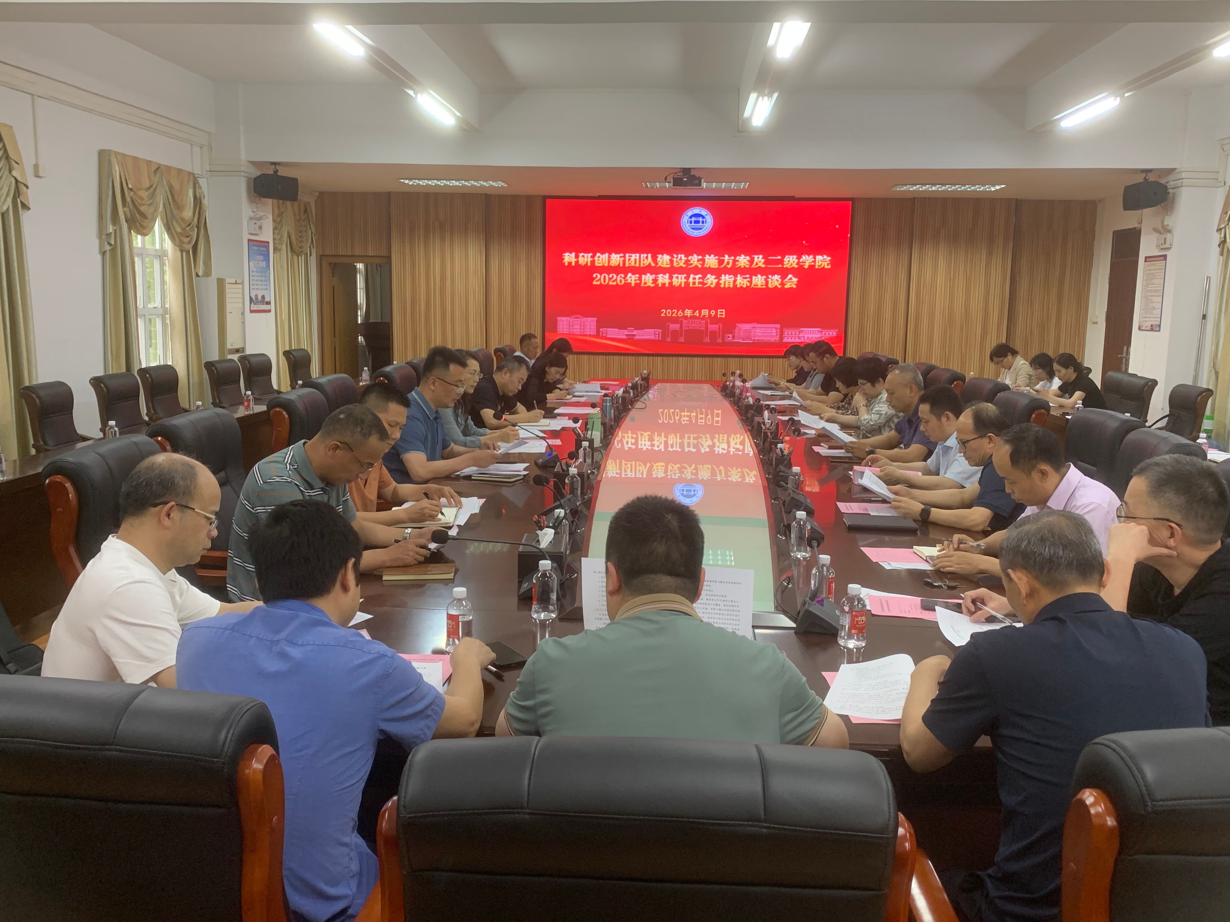本网讯 4月9日,学校召开“科研创新团队建设实施方案及2026年度科研任务指标座谈会”。校长李琴、副校长肖起清出席会议,科学技术部部长徐士河主持会议。各二级学院院长等参加会议。