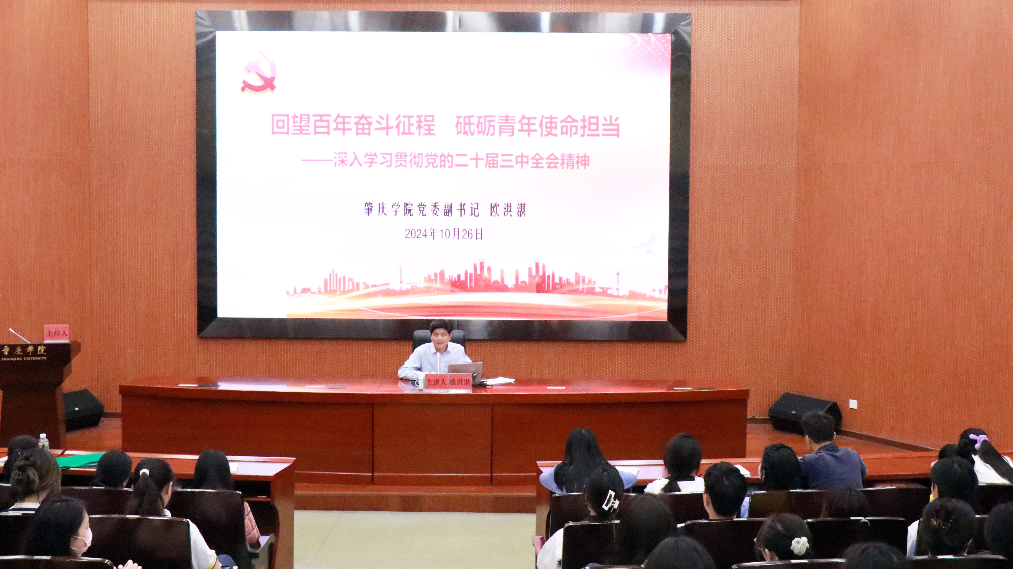 欧洪湛以《回望百年奋斗征程,砥砺青年责任担当——深入学习贯彻党的二十届三中全会精神》为题,紧密围绕党的二十届三中全会主题,从国际形势、国内时政和学校的发展历程与成效切入,结合当前大学生面临的挑战和机遇,运用丰富的案例和展示视频,以平实的语言风格和广阔的视野,带领大家认真学习党的二十大和二十届三中全会精神。通过纵向对比历届三中全会的任务要求,深刻阐释中国共产党的使命任务。他以发展的思维,帮助大家更好地了解在世界百年未有之大变局和中华民族伟大复兴的战略全局,以及当前面临的使命担当,提升青年大学生家国情怀,并以“爱国三问”指出青年大学生应当如何担当作为,用“砚园三问”来指出青年大学生应当如何提升自我。他鼓励大家树立远大的报国强国志向,做勇于担当的奋斗者,将青春挥洒在建设中国式现代化的伟大征程中,努力成为有理想、敢担当、能吃苦、肯奋斗的新时代好青年。