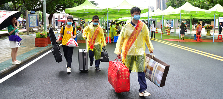 在学校统一布置下,各职能部门参与到迎新工作中,分别做好总协调、新生报到点安排、宿舍安排、校园安保、后勤服务、宣传、后勤保障等工作。各二级学院在统一迎新点做好新生报到注册等工作。按照当前疫情防控常态化工作要求,我校严把新生入校安全关。进校的新生需要经过粤康码出示、体温监测、行李消毒等程序。此外,为了维护疫情防控的平稳,我校今年对新生登记、注册、缴费等手续进行了适当简化,除现场进行的必要报到程序外,充分利用网络技术手段,指引新生“线上”完成后续报到手续,个别手续也将于新生报到后由所在二级学院统一组织办理。