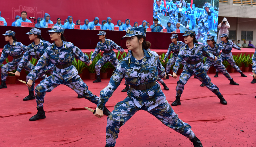 教官示范表演招招式式,拳拳到位,无不体现出军事训练的严谨,无不彰显出教官们的非凡的气魄和坚毅的意志力。赢得师生阵阵掌声。