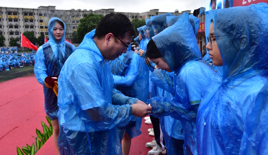 谢冠华为各二级学院的新生代表佩戴校章,并向军训团团长、党委武装部部长黄镜辉授旗。