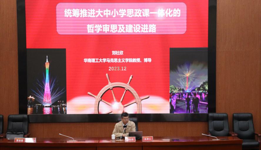 会议邀请华南理工大学刘社欣教授作题为《统筹推进大中小学思政课一体化的哲学审思及建设进路》的主旨报告。报告围绕主题,从摆事实、讲问题开始,结合国家政策要求,提出了发挥思政课作用、整合思政课资源、增强思政课活力的思路,并重点论述了个人对于推进中大小学思政课一体化建设的路径思考。
