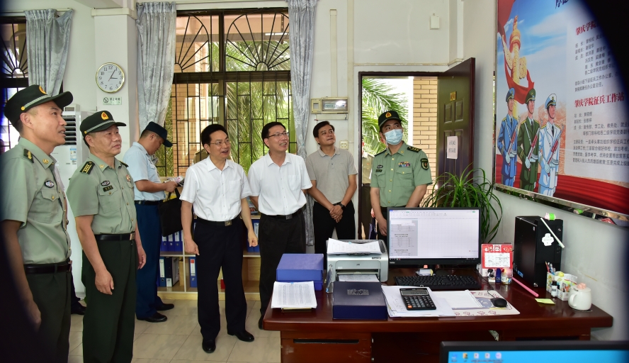 本网讯 6月15日,肇庆市检查调研组及端州区检查调研组一行到我校开展征兵调研工作。校党委副书记谢冠华,党委宣传部、统战部部长陈前,学生工作处处长陈向荣和武装部部长黄镜辉等相关部门负责人参加本次调研。校园考察结束后,双方在临峰厅召开征兵工作调研。