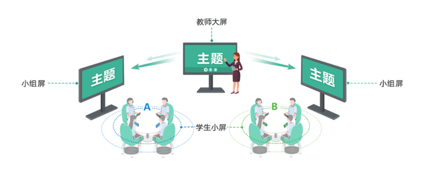 智慧教室中配备多个智慧屏,教师大屏、小组中屏、学生设备屏间能实现轻松交互,学生可随意在视野范围内看到学习内容。在小组讨论情景下,学生可以将讨论结果投屏在小组中屏,与组内成员、其他小组同学以及老师分享。