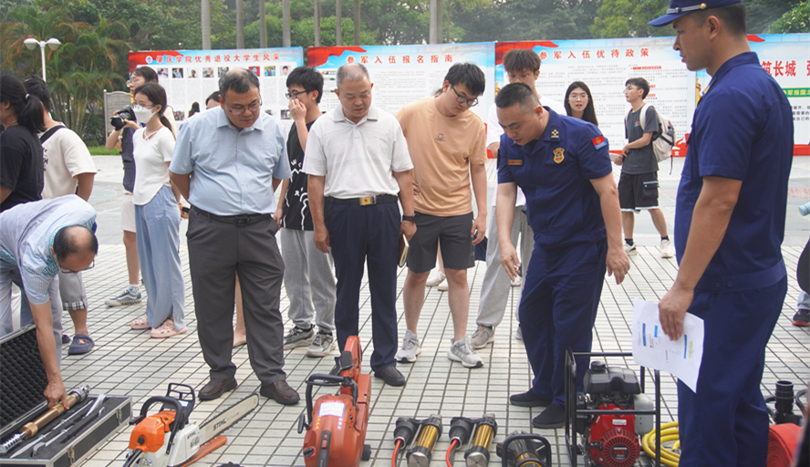 本网讯 6月9日,我校联合端州区消防救援大队举办消防安全骨干业务培训会。会前,消防救援大队对第一教学楼、第三饭堂等校园区域的消防安全设施进行实地检查。会后,参训人员在消防队员的指导下进行应急逃生演练,并实地体验消防设备操作。副校长李新昌出席活动。