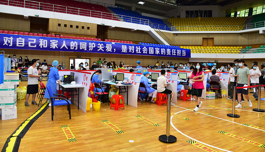 在作为接种现场的体育馆,设置了信息登记、健康咨询、疫苗接种及休息留观等区间,并安排了志愿者进行引导和维护秩序。按照流程,师生排队进场,录入个人身份信息,接受医务人员的健康咨询,在健康条件允许的情况下接种新冠疫苗,再到留观区休息30分钟,无不良反应方可离场。