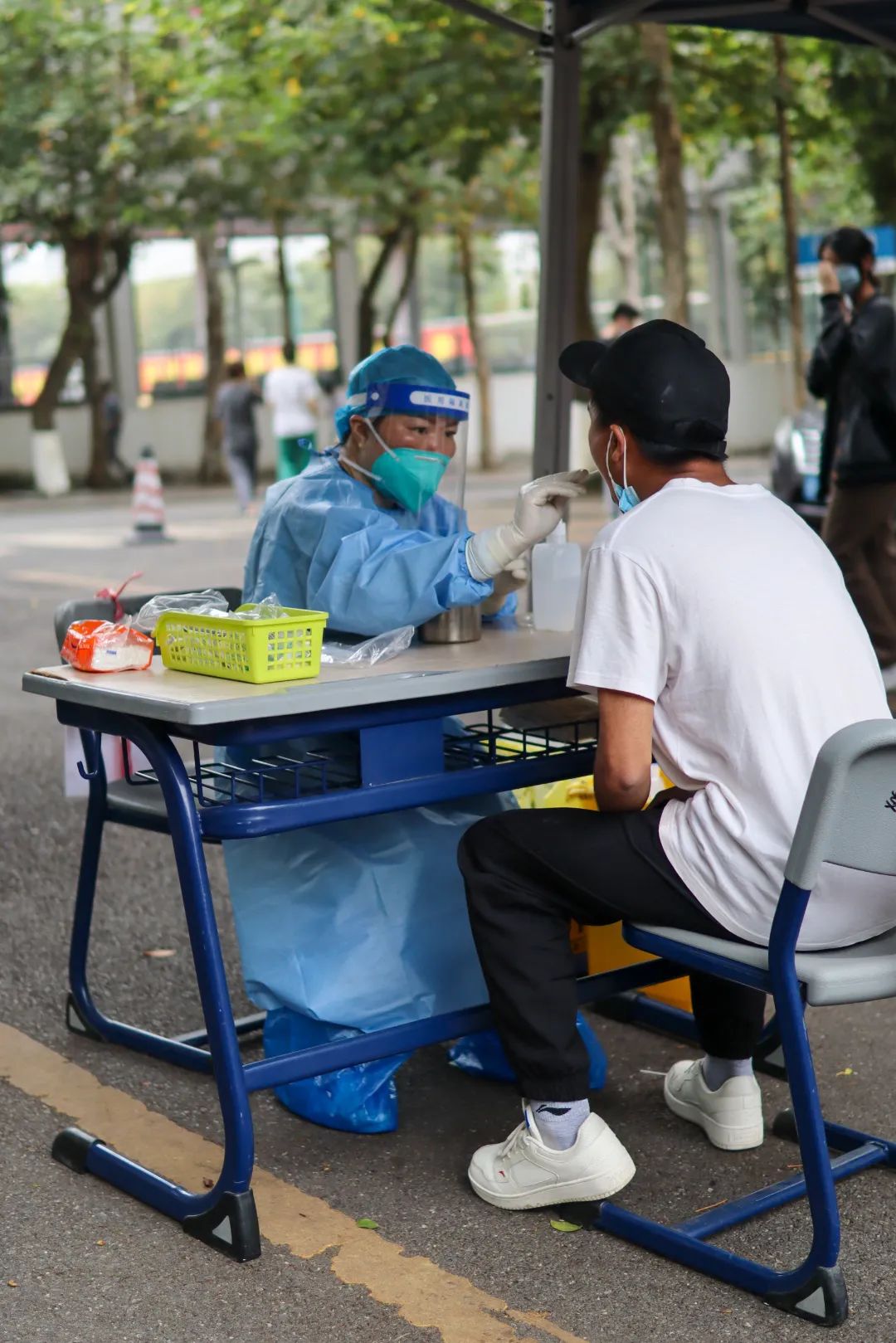 检测现场秩序井然,师生提前在“粤核酸3”小程序上录入信息,由学生志愿者负责核对无误之后,依次接受检测。第一批接受核酸抽测的师生,检测结果均为阴性。