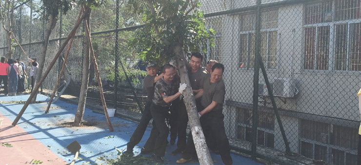 本网讯 9月19日上午,机关干部集体出动,把在超强台风中倒地的树木扶正种好,为校园重新披上美丽的绿衣裳。机关干部用这个实际行动表明,超强台风可以吹倒高大的树木,但却吹不倒肇庆学院灾后重建的意志。