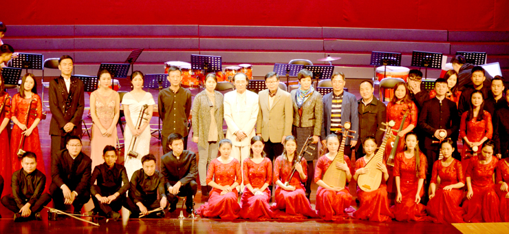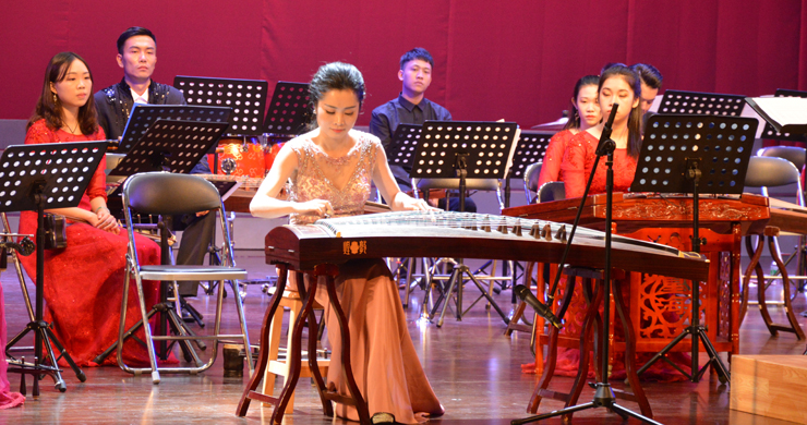 晚会上,民乐团相继献上各种风格的民族乐曲。民族室内乐《彩云追月》、广东音乐《花好月圆》如空谷幽兰沁人心脾,像轻风拂过山岗,如落花飘在水上,观众们在品味经典的过程中,感受到了民族音乐的独特魅力。热情豪放、铿锵有力的《龙腾虎跃》《战马奔腾》则以动感的节奏,在视觉上和听觉上给观众带来了昂扬向上的激情,把整个会场气氛推向高潮。《打虎上山》《牧民新歌》《月圆曲》《阳光照耀在塔什库尔干》《旱天雷》等节目,各具特色,赢得观众阵阵的掌声。晚会最后在喜气洋洋的广东音乐《娱乐升平》中落下帷幕,为师生们带来了新年的美好祝福。