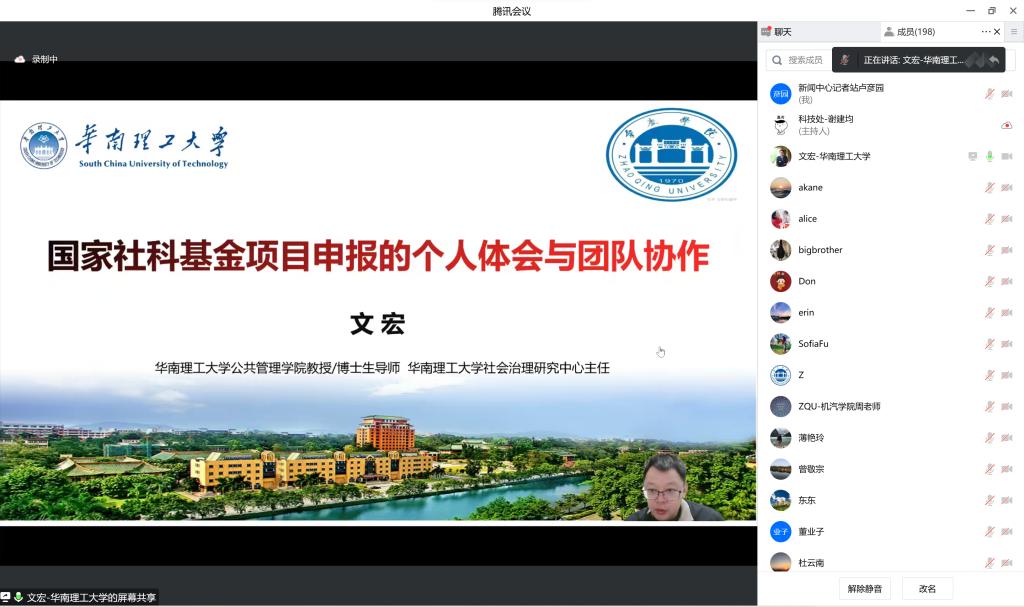 本网讯 12月1日,我校召开2023年自然科学、社会科学高层次科研项目申报辅导报告会(线上),来自广东省科学院生态环境与土壤研究所研究员刘承帅、华南理工大学公共管理学院教授、博士生导师文宏分别受邀作自然科学、社会科学科研项目申报专题辅导报告,副校长胡文涛出席并作讲话,科技处、社科处主持工作副处长徐士河主持会议。