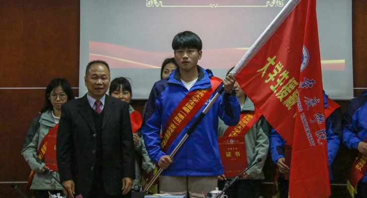 此次参加援藏支教的学子大部分都是党员,学校同意成立第四批大学生援藏支教志愿服务队临时党支部。仪式上,黄劲松向服务队临时党支部颁授党旗,向服务队颁授队旗,欧洪湛向队员们颁发证书,与会领导还为队员们佩戴象征责任和荣誉的红色绶带。最后,支教队员们进行了庄严的宣誓,并在队旗上签名,表达坚决完成援藏支教任务的决心和斗志。