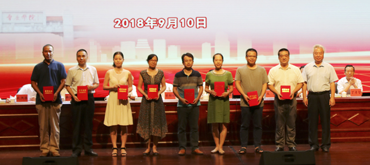 本网讯 9月10日,我校举行2018年教师节表彰大会,庆祝我国第34个教师节,表彰为教学科研作出贡献的优秀教师,激励广大教师弘扬高尚师德,潜心立德树人,齐心协力推动学校事业发展。大会号召,全体教师以习近平新时代中国特色社会主义思想为指导,全面贯彻落实党的十九大精神,坚定社会主义办学方向,落实立德树人根本任务,增强“四个意识”,坚定“四个自信”,不忘初心,牢记使命,携手推进省市共建与转型发展工作,为我校胜利实现建设特色鲜明的高水平应用型综合大学的奋斗目标努力奋斗。