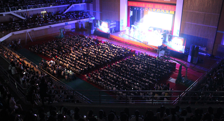 本网讯 祖国在我心中,我在砚园路上。9月28日晚,我校举行大型“庆国庆·迎新生”文艺晚会,欢庆伟大祖国67岁华诞,并欢迎2016级新同学。校党委书记曾桓松、校长和飞、校党委副书记叶峥嵘等校领导出席,各有关部门负责人及全体新生计六千多人共同观赏晚会。