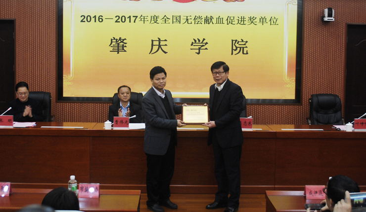 本网讯 1月7日,肇庆市全国无偿献血先进市(单位)授牌暨创建工作动员大会在我校举行,我校获颁2016-2017年度全国无偿献血促进奖。