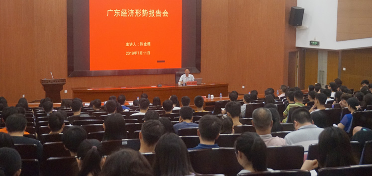 本网讯 7月11日,省科学技术厅生产力促进中心主任陈金德博士受邀为我校师生作广东经济形势报告会,帮助广大师生正确认识当前国家和我省经济形势。校党委副书记谢冠华主持,各二级学院党委负责人、教师学生代表,各单位中层领导干部代表等400多人参加。