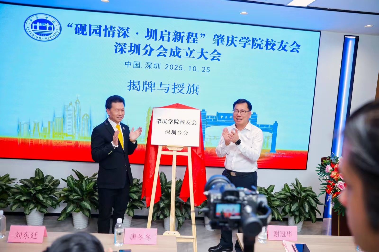 大会举行了庄重的揭牌与授旗仪式。谢冠华与理事会成员共同为“肇庆学院校友会深圳分会”揭牌,并为分会授旗。