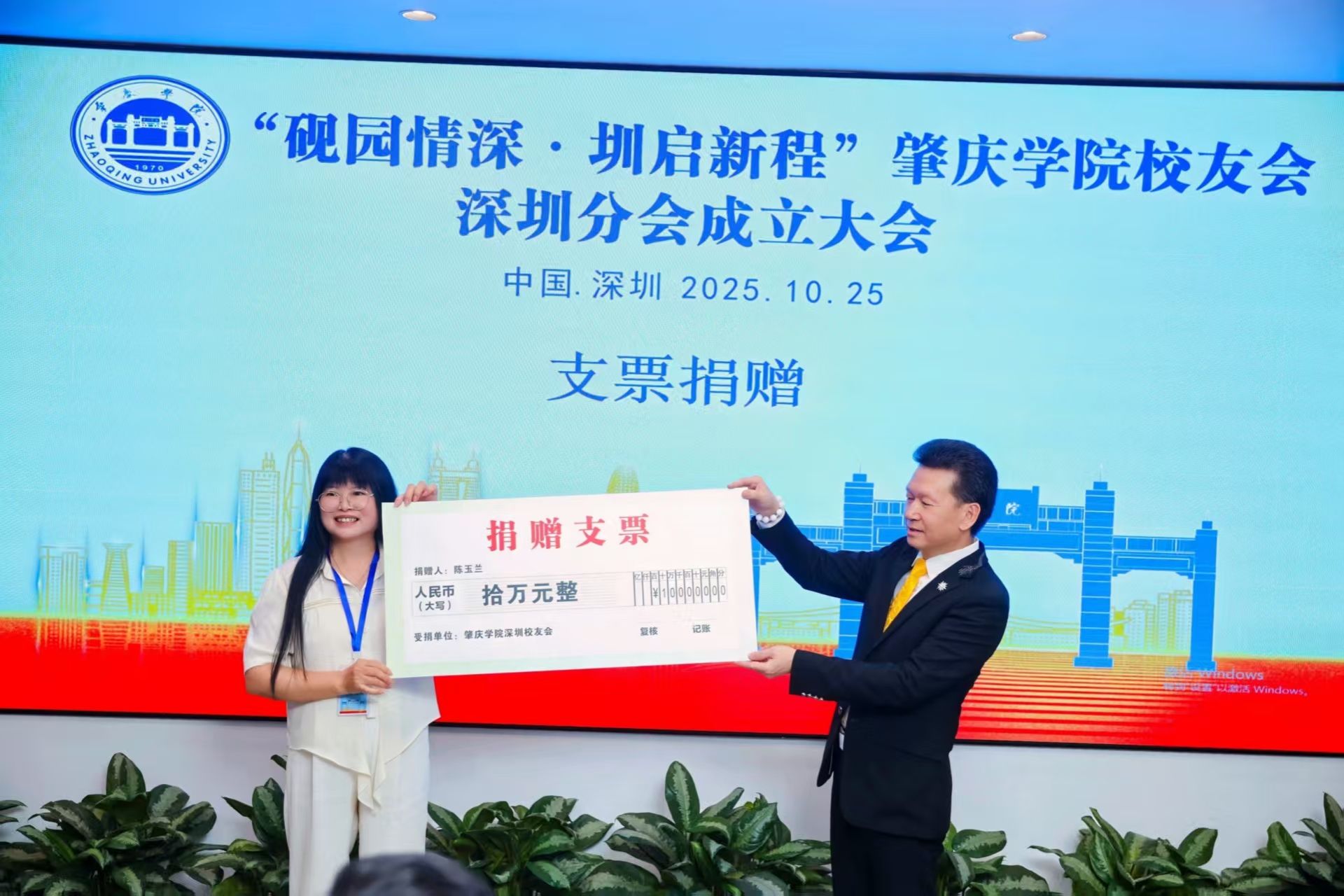 活动中,深圳校友代表结合自身经历,讲述了从砚园学子到深圳建设者的成长故事。大会尾声,华希国际教育董事长陈玉兰女士(常务会长)为深圳校友会捐赠10万元,用于支持分会建设。值得一提的是,该笔捐款将与深圳校友会此前筹集的善款一并捐赠至学校基金会,作为母校55周年校庆的特别礼物。
