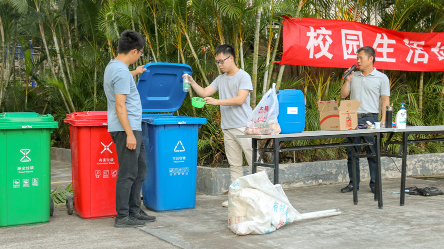 本次活动旨在让师生对垃圾分类形成更深刻的理解与认识,对垃圾分类的重要性与意义上形成共识。现场,工作人员讲解了可回收物、有害垃圾、厨余垃圾、其他垃圾的不同分类概念、种类类别、投放注意事项等,并现场演示四类垃圾具体投放操作方法。现场观众对各类垃圾具体处理方法展开提问,工作人员一一解答。目前,我校两个校区共设定5个四分类垃圾桶投放点,其中主校区4个,星湖校区1个。此外,教学楼和办公区域设定两分类垃圾桶,生活区设定三分类垃圾桶投放点。