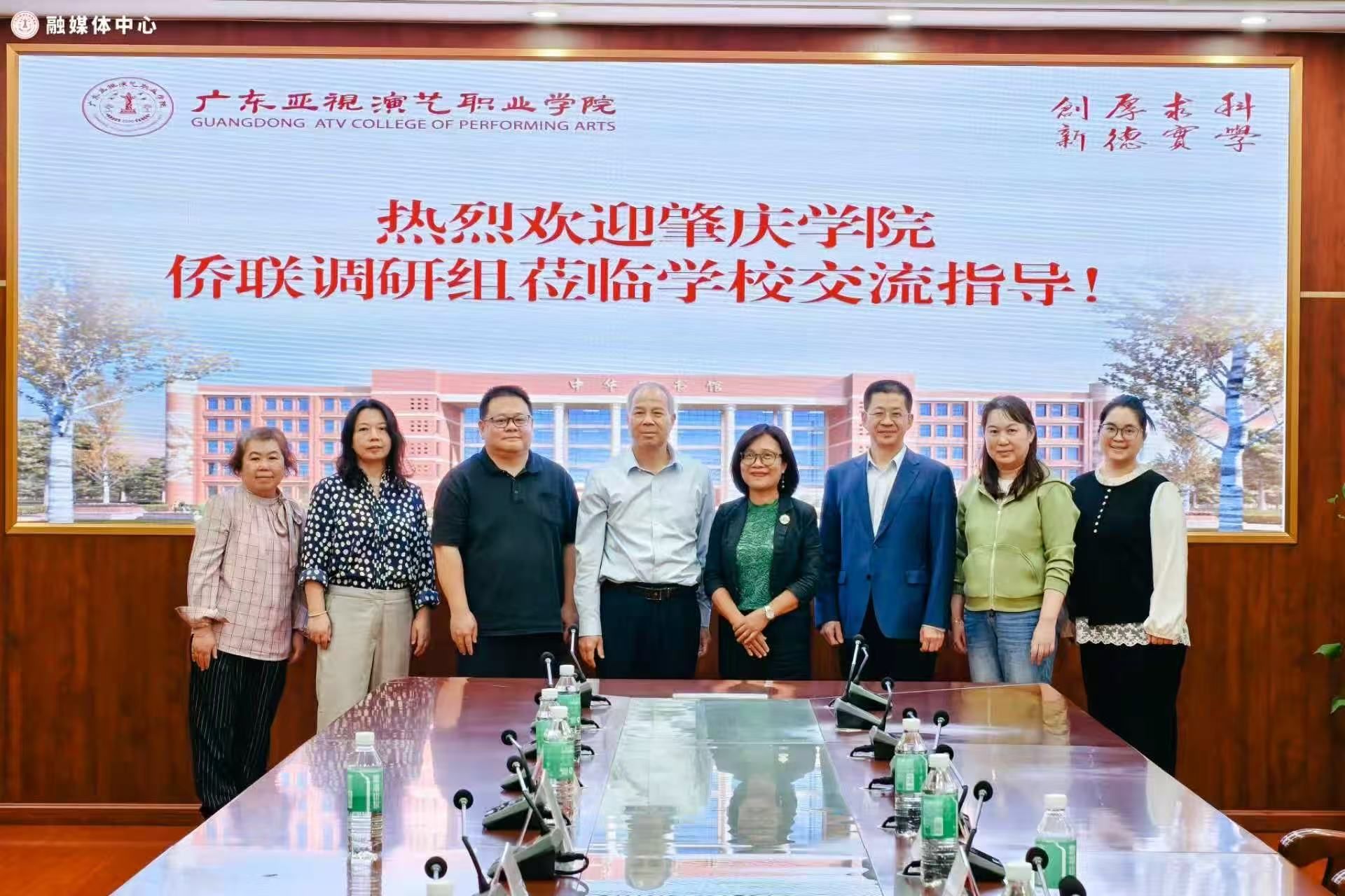 在与广东亚视学校的专题座谈中,双方围绕侨联组织建设、侨界资源整合、国际教育合作等议题交流。肇庆学院侨联主席黎达文分享了学校"八大行动"凝聚侨力、教育援藏及侨史研究经验;广东亚视演艺职业学院党委书记谭冠中介绍“德技并修、服务社会”办学理念及艺术传媒专业成果。双方就华侨文化进校园、学术资源共享、侨界人才引育达成共识,肇庆学院侨联将发挥省高校侨联联盟理事单位优势提供侨务支持与研究成果共享。