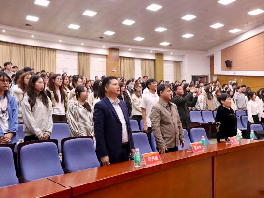 本网讯 12月8日,学院与学校“红色行”辅导员工作室共同举办红色经典诵读活动,通过诵读毛泽东诗词,从字里行间涌动的磅礴力量与深邃智慧汲取奋进力量。活动由肇庆市教育学会阅读推广委员会高级顾问、肇庆市新兴商会红色文化顾问陈克导读,“红色行”辅导员工作室主持人唐艳秋主持,学院院长曹和修、学校校友总会理事兼学校招生委员会委员刘兴隆、肇庆市教育协会阅读推广委员会副理事长兼肇庆红色书法创作基地主任梁泉实,以及学校师生代表共300余人参加。